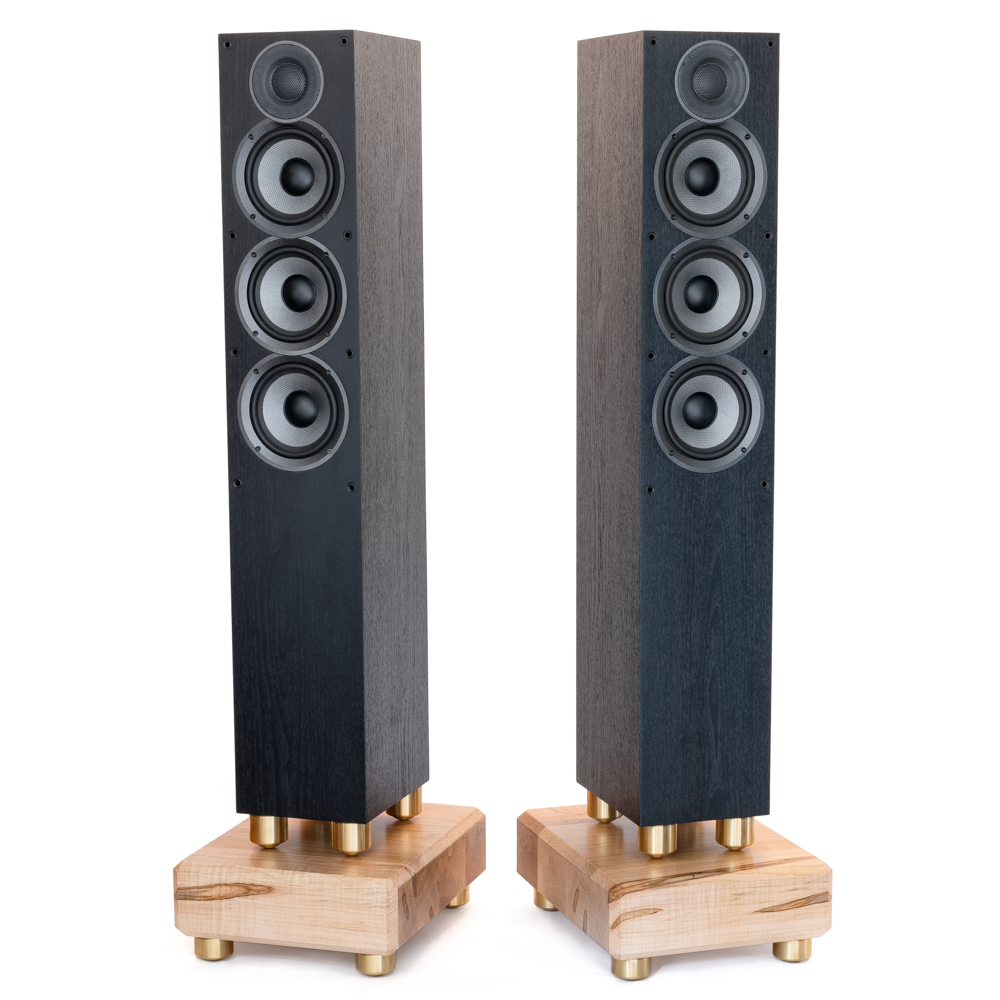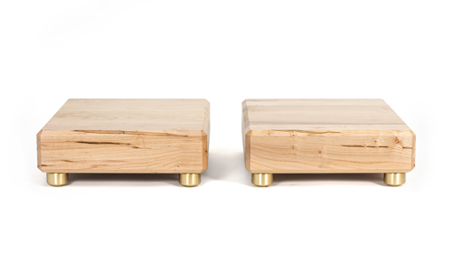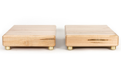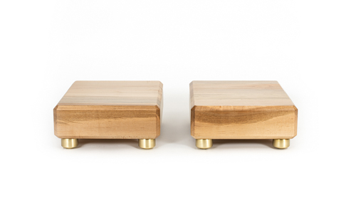 To double the sonic upgrade of our Maple Speaker Plinths, replace your speakers' steel spikes or damped composite feet with our much more rigid and massive brass footers to optimally couple each speaker to its Plinth. We make Maple Plinths to fit both smaller and larger size floor-standers. To increase the mass and reduce speaker rocking, we recommend a Plinth at least two inches larger than the speaker width and depth. If you're on concrete, tile or stone, upgrading to the 4" thickness is highly recommended. Note that, in careful listening comparisons, the effect of an extra 2" height is minuscule compared to the major improvements in bass, midrange and treble.