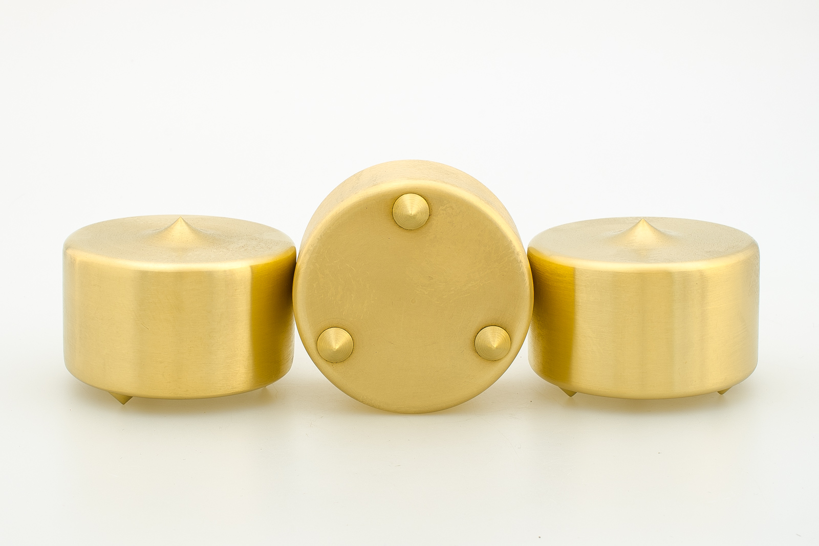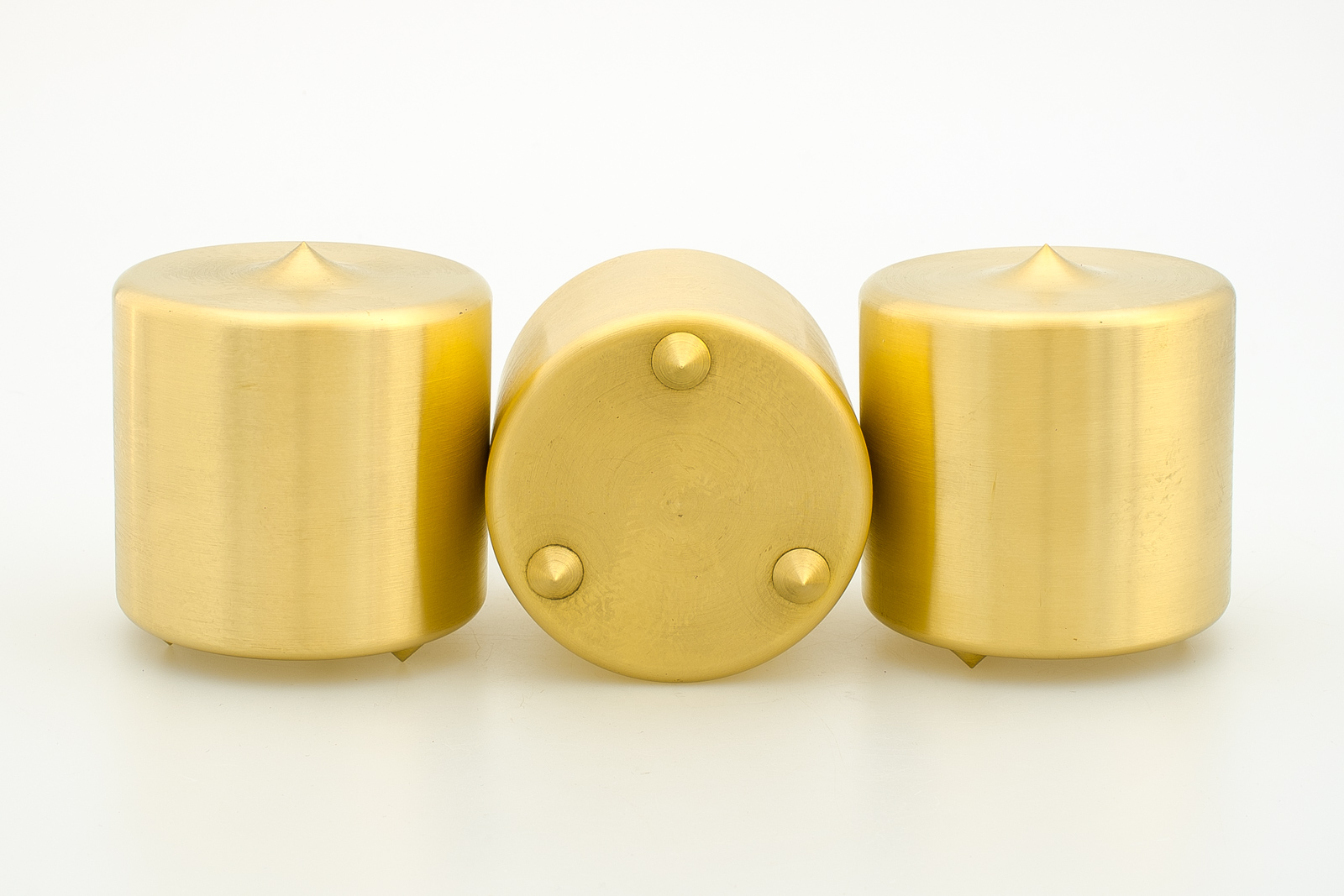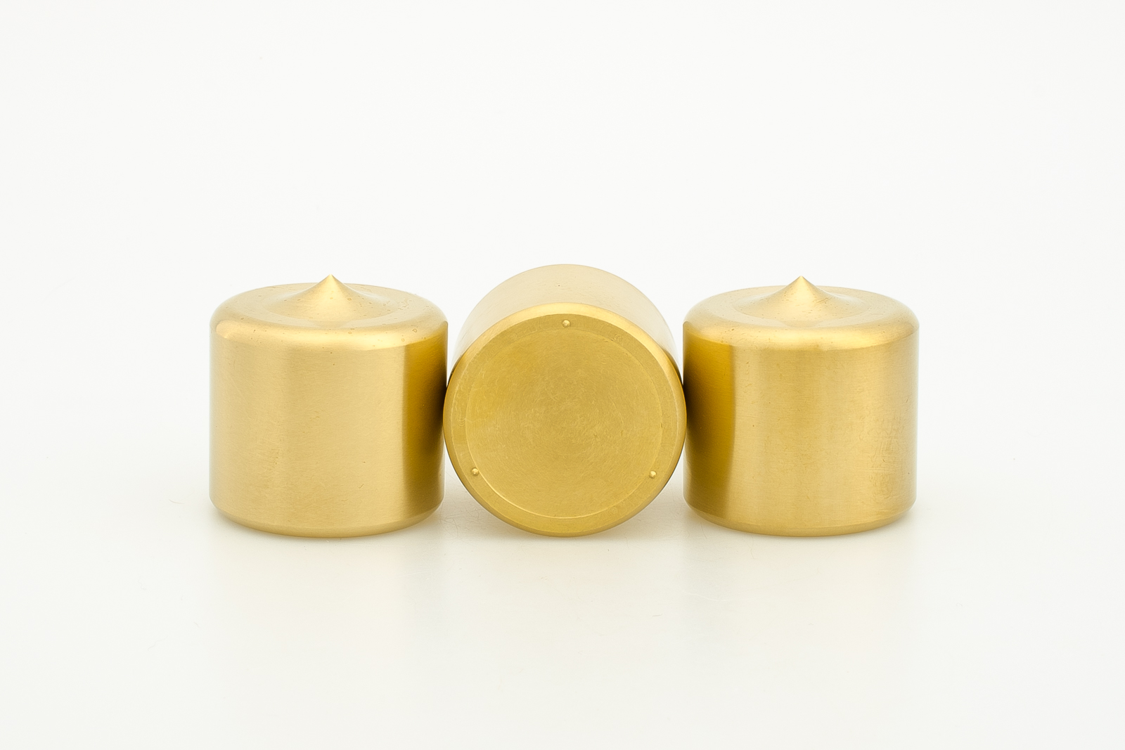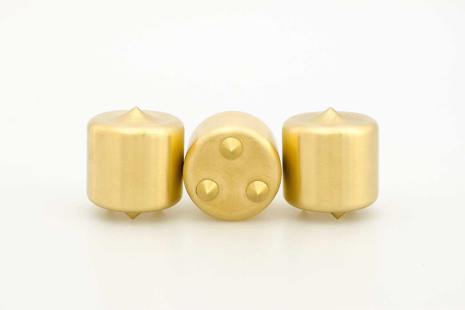 Our best-sounding brass footers all have a three-point top, Mapleshade's unique advance over the greatest weakness of conventional cone footers: the flat top. That three-point contact eliminates the unavoidable micro-rattles between a flat-topped footer and the imperfectly flat bottom of the component it's supporting. Adding the three points on top yields surprising more punch and detail everywhere—from the deep thunder of the tympani to the silvery treble overtones of the triangles