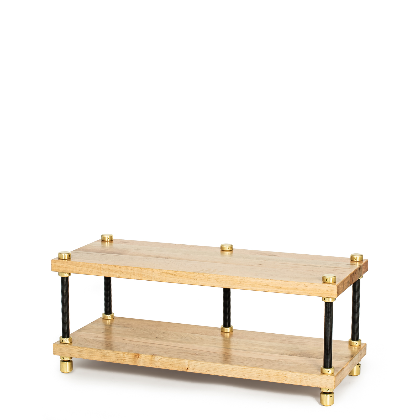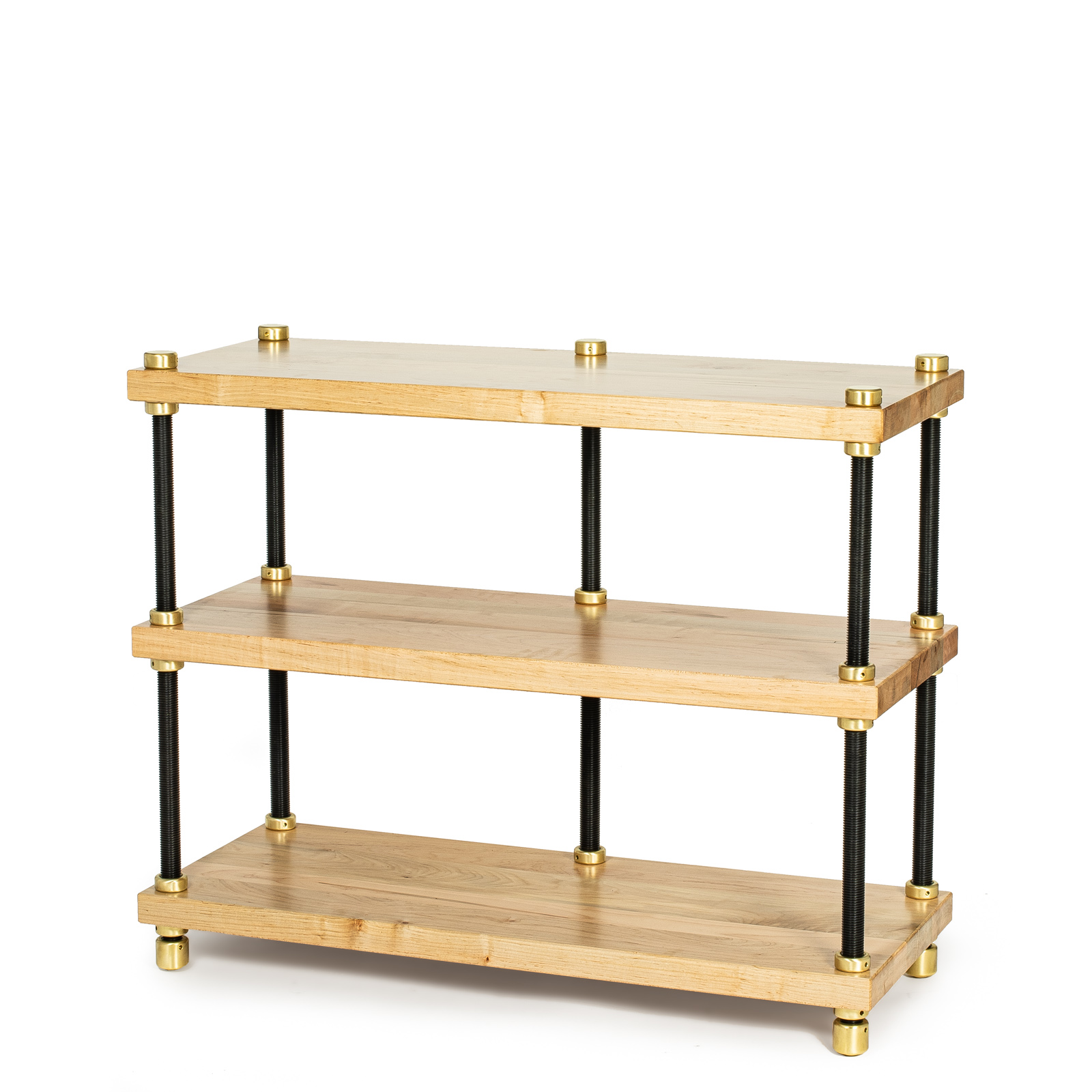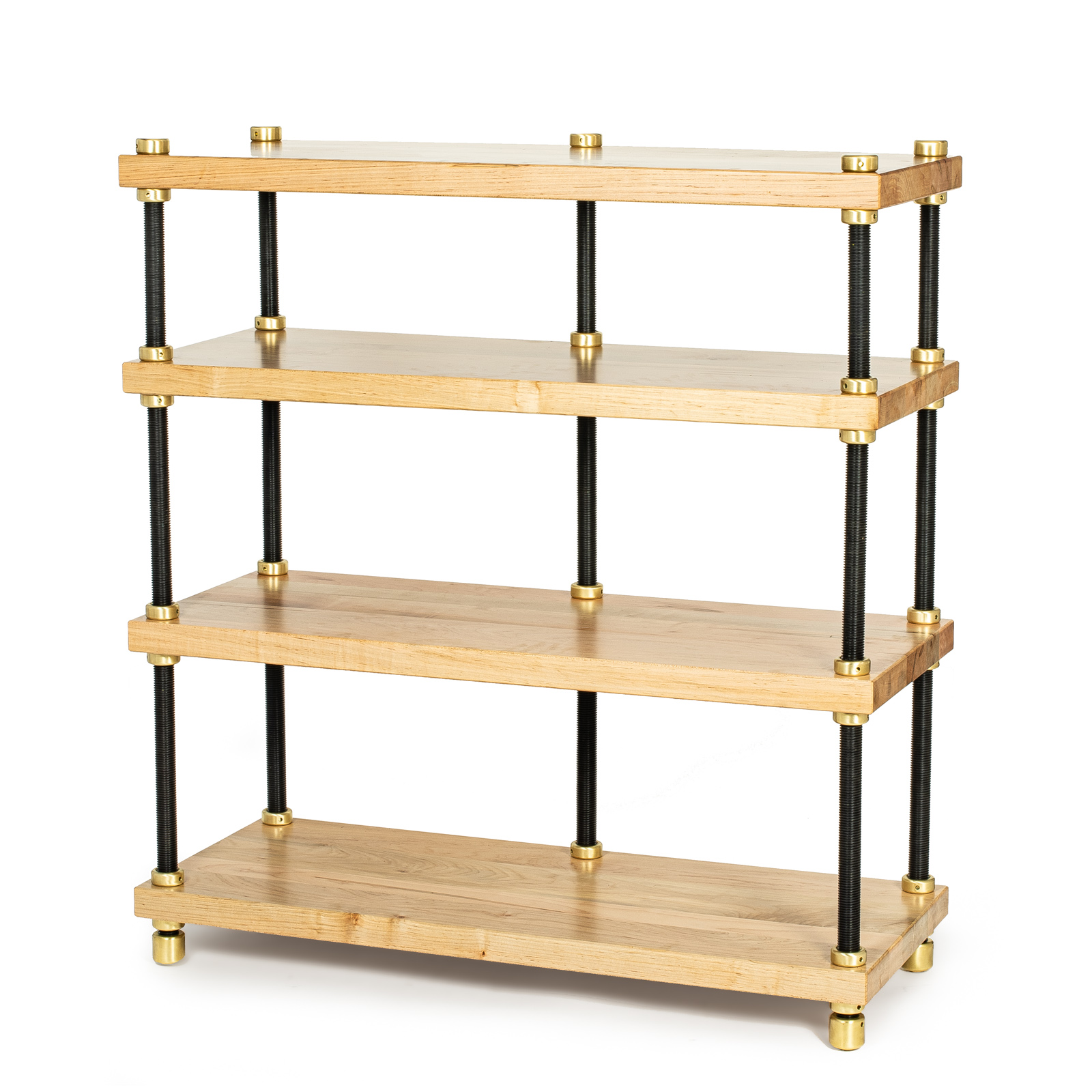 • Each maple shelf is locked to the 1¼" threaded solid steel uprights by being captured with crushing force between two massive threaded round brass nuts at each corner. This yields a totally rigid vibration path and zero perceptible or measurable side sway. The 1¼" uprights thread directly and rigidly into threaded brass Heavyfeet or Megafeet—the most massive footers offered on any available equipment rack.