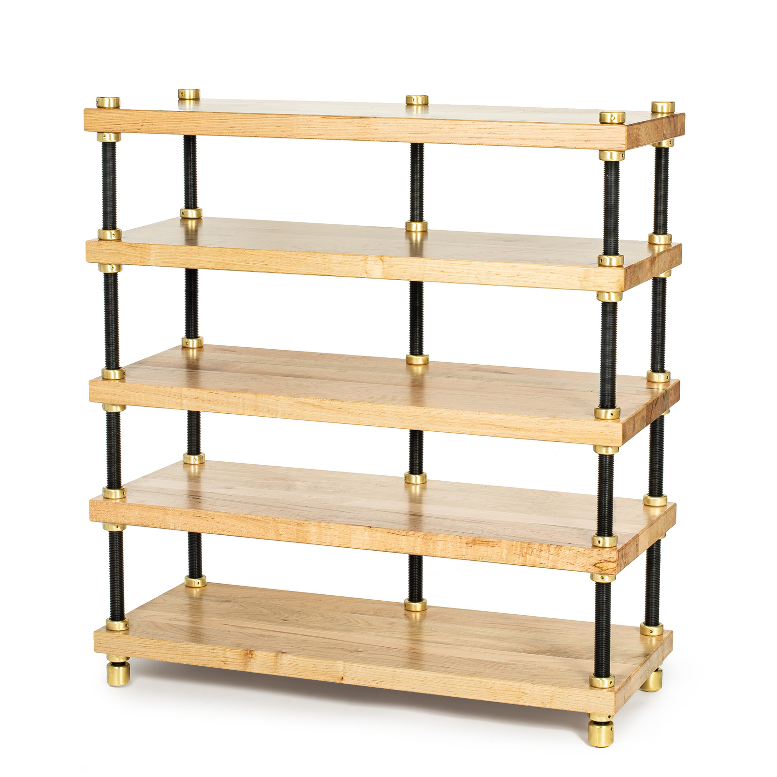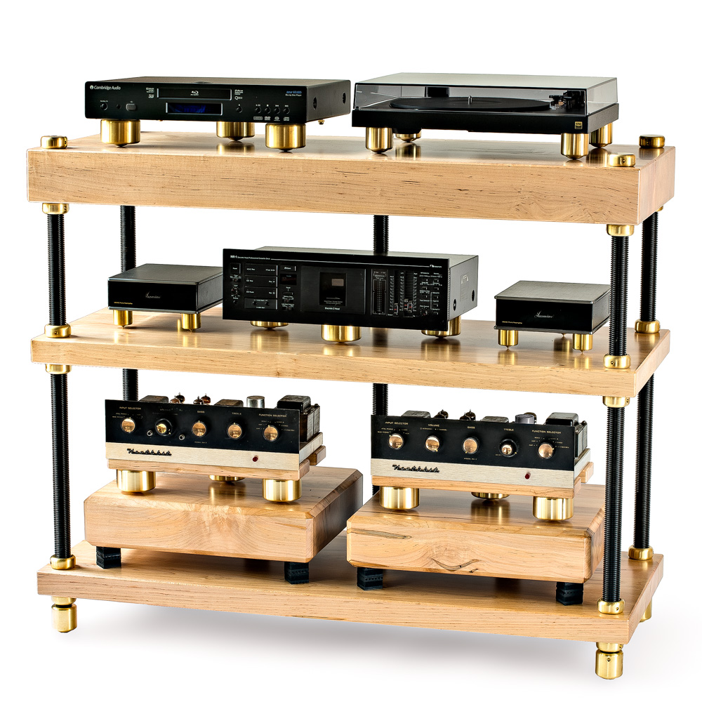 • The shelves are 2" and 4” air-dried maple cut only from old-growth logs and air-dried for 3 to 6 years. 2" solid maple is over 60 times as stiff as the 3/4" veneered MDF shelves of most conventional audio racks.