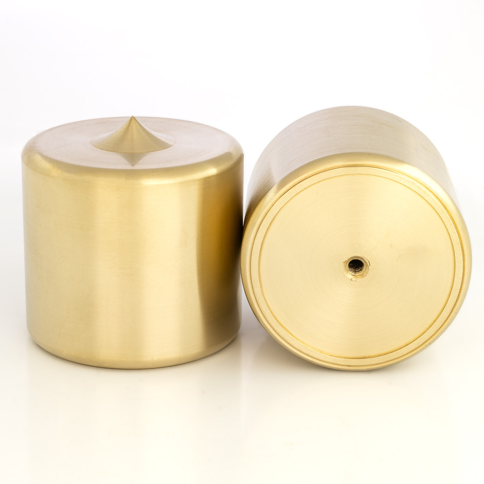 Rigid, resonance-free and massive, our solid footers lock the component or speaker into place using point contact, an essential for draining vibration cleanly. The footer's mass, shape and, most importantly, material all make a big difference. We've tested every promising high-tech material: ceramics were too bright; titanium, carbon fiber, stainless steel, myrtle, aluminum and ebony were dull and smeared compared to brass. Our proprietary alloy brass was by far the best-sounding footer material: much more dynamic, vibrantly warm, and more detailed. Take advantage of our money back guarantee and make your own comparisons against other footers, even ones costing 10 times more.