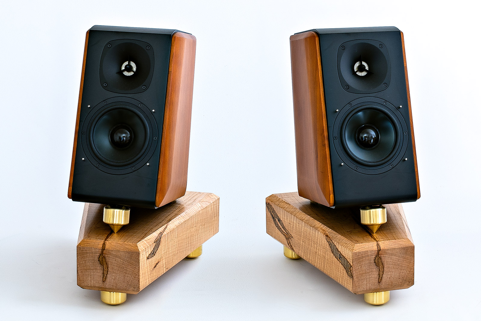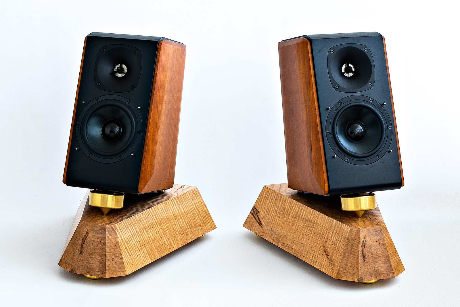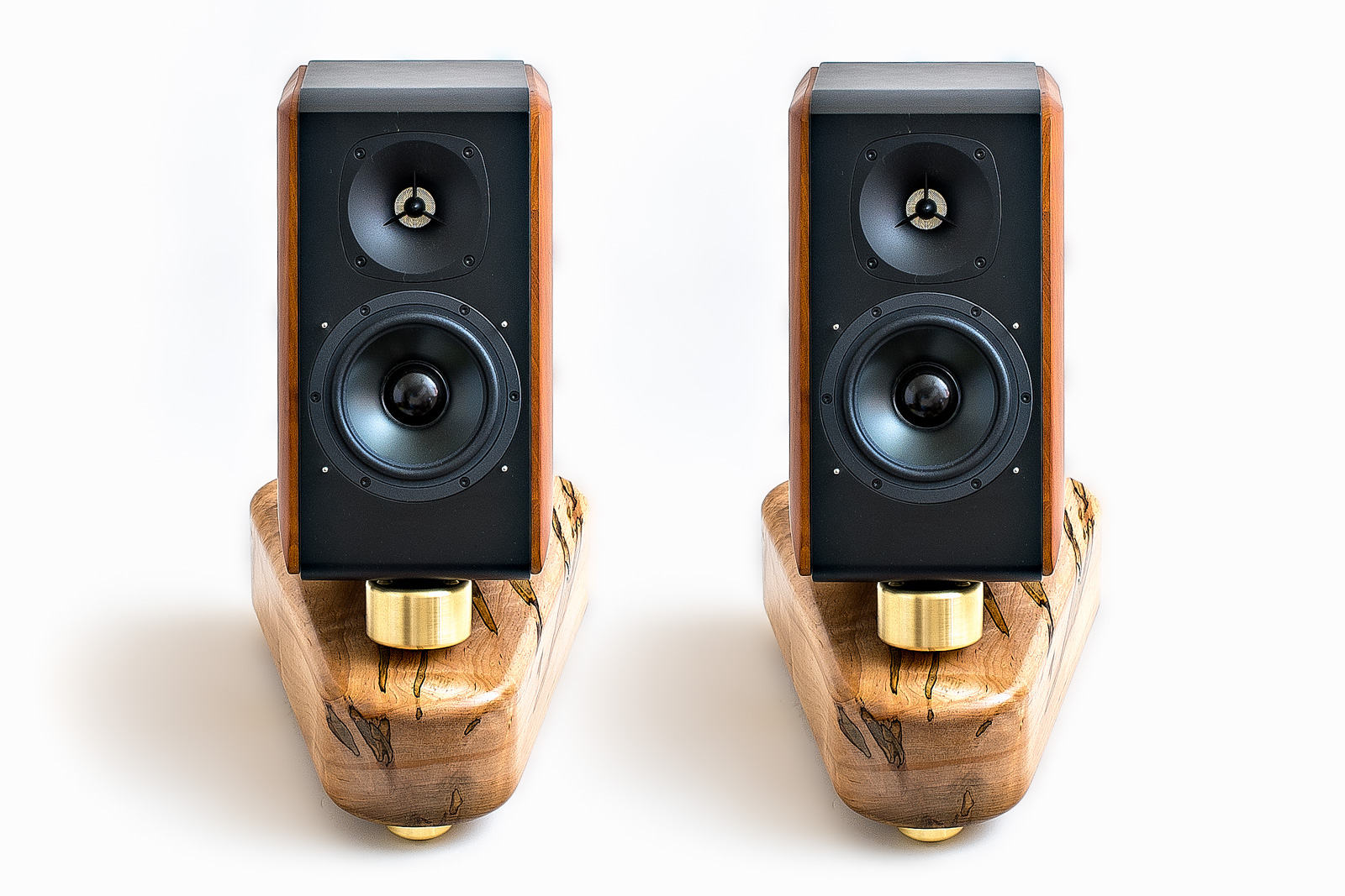 Only low-to-the-floor mounting can make bookshelf/monitor speakers sound so huge, warm and transparent. Conventional tweeter-at-ear-level stands actually make monitors sound thin and small—the taller the stand, the more this worsens. Bedrocks' on-the-floor adjustable tiltback positioning, combined with solid air-dried maple base and heavy vibration-draining brass footers, yield amazing transients and details. Percussion and piano attacks gain startling potency. Above all, bass power and articulation improve dramatically—enough to consider crossing subwoofers off your wish list. The soundstage image floats well above the floor and can be precisely adjusted for seamless on-screen integration in home cinema systems.