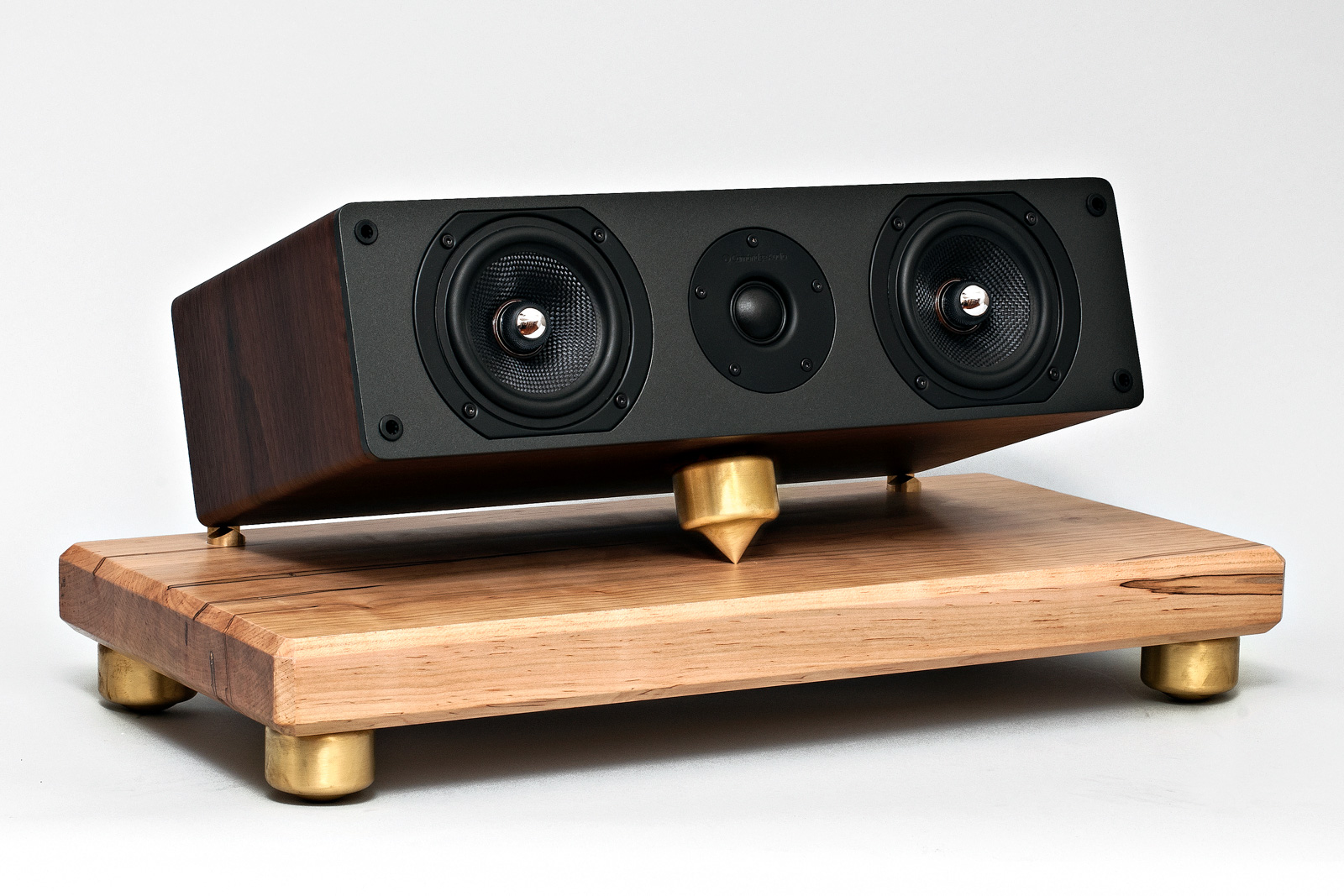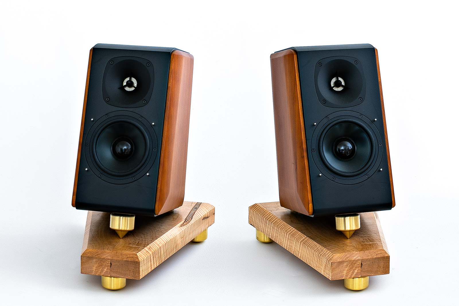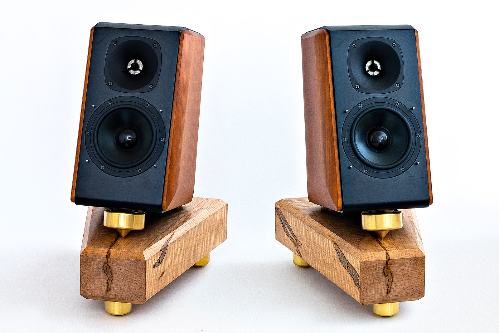Only low-to-the-floor mounting can make bookshelf/monitor speakers sound so huge, warm and transparent. Conventional tweeter-at-ear-level stands actually make monitors sound thin and small—the taller the stand, the more this worsens. Bedrocks' on-the-floor adjustable tiltback positioning, combined with solid air-dried maple base and heavy vibration-draining brass footers, yield amazing transients and details. Percussion and piano attacks gain startling potency. Above all, bass power and articulation improve dramatically—enough to consider crossing subwoofers off your wish list. The soundstage image floats well above the floor and can be precisely adjusted for seamless on-screen integration in home cinema systems.