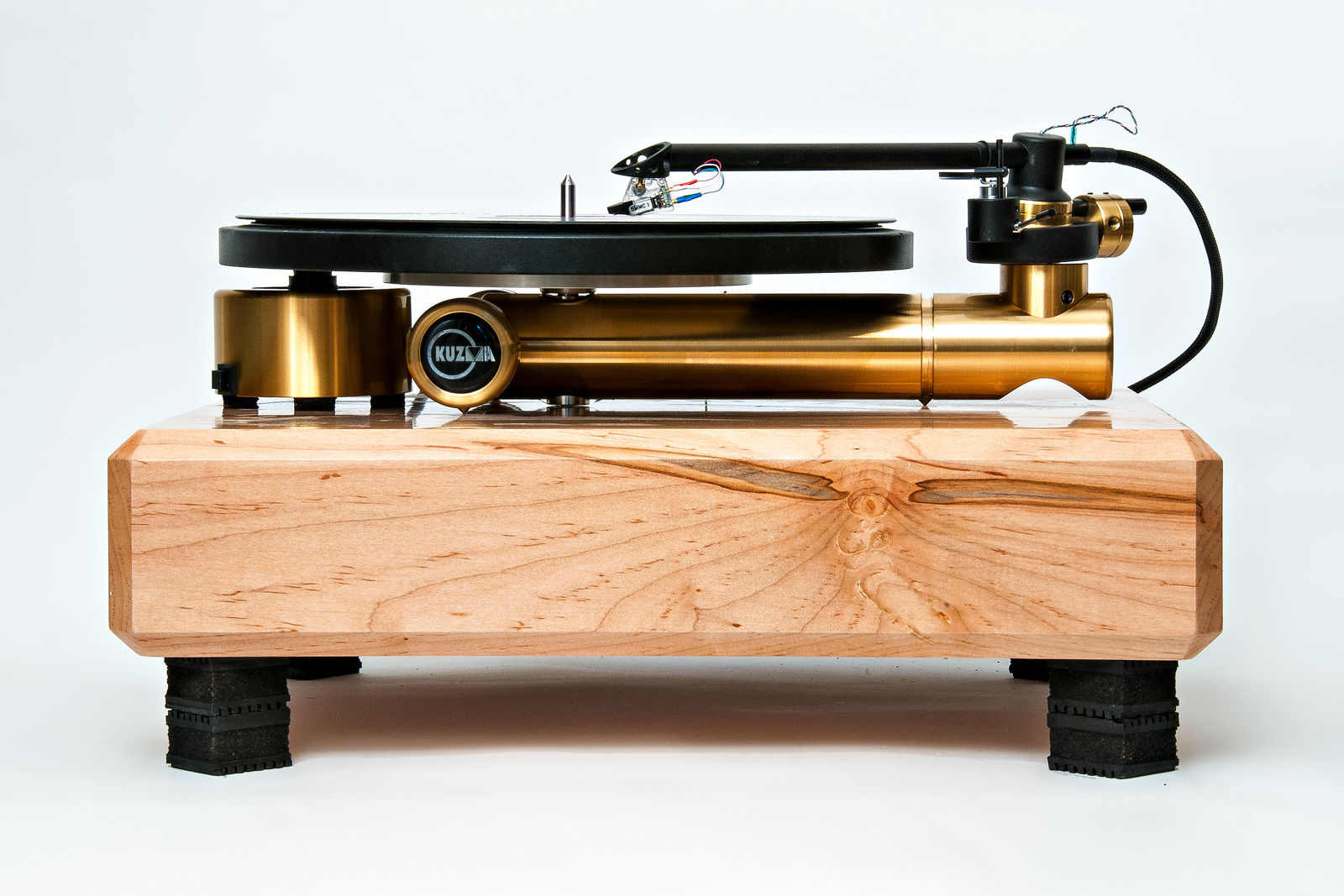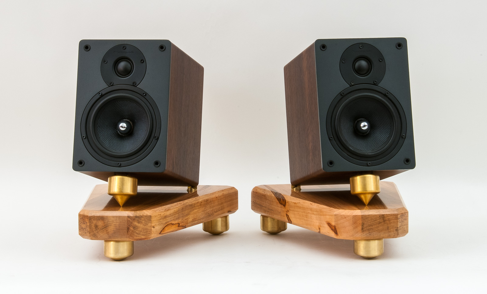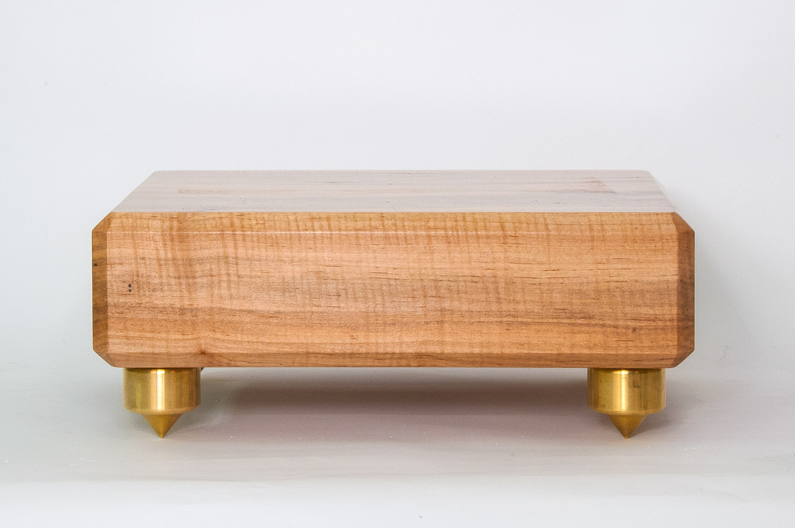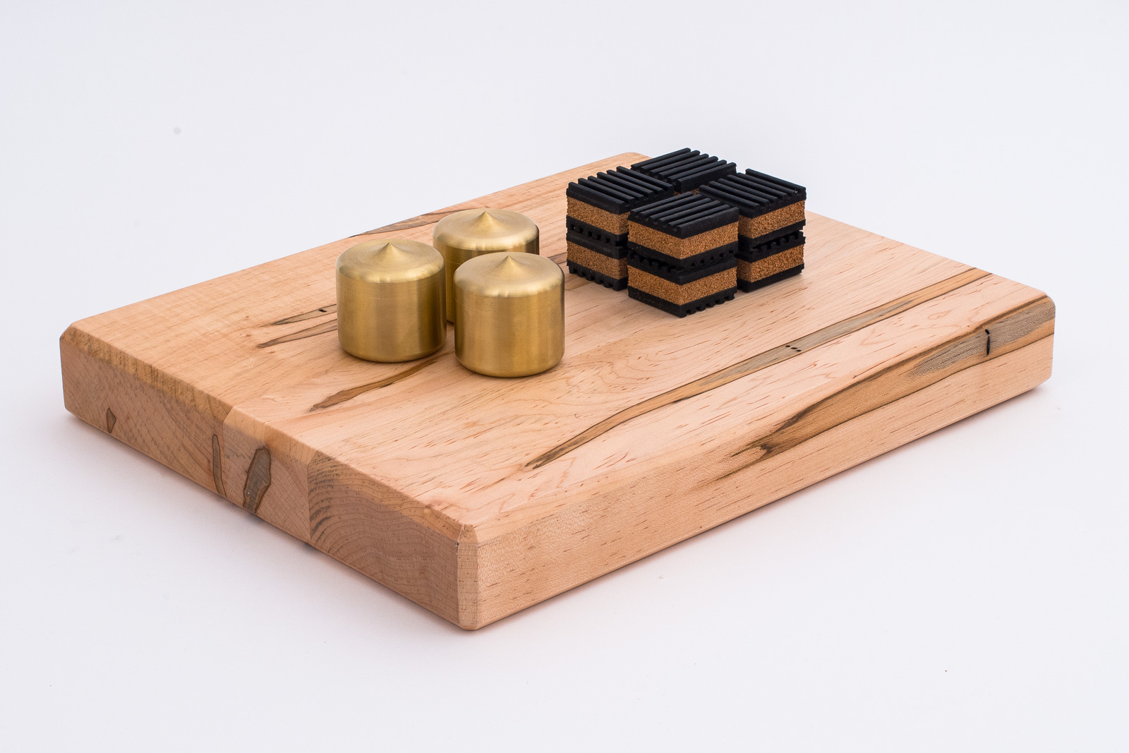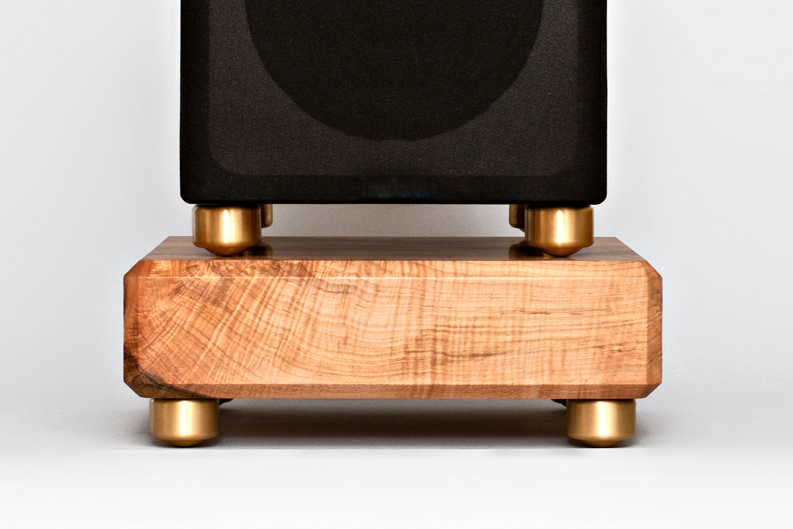 We have two Vibration Control Systems, one for speakers and one for components. Our speaker system has three elements: hefty brass footers under the speaker to efficiently drain vibration out of the speaker cabinet and down into its platform; a massive air-dried maple platform to receive and dissipate that vibration; and another set of brass footers under the platform for rigidly supporting everything above so that the speaker can't rock, even microscopically. Our component system design differs in only one important respect: because components are not affected by slight rocking, instead of rigid brass footers under the maple we use Isoblocks as a tuned compliant suspension to isolate the platform from resonances in the shelf or furniture below. Each of our three elements used alone will upgrade your sound. Used together as a system, they yield startling improvements in bass, midrange and treble.