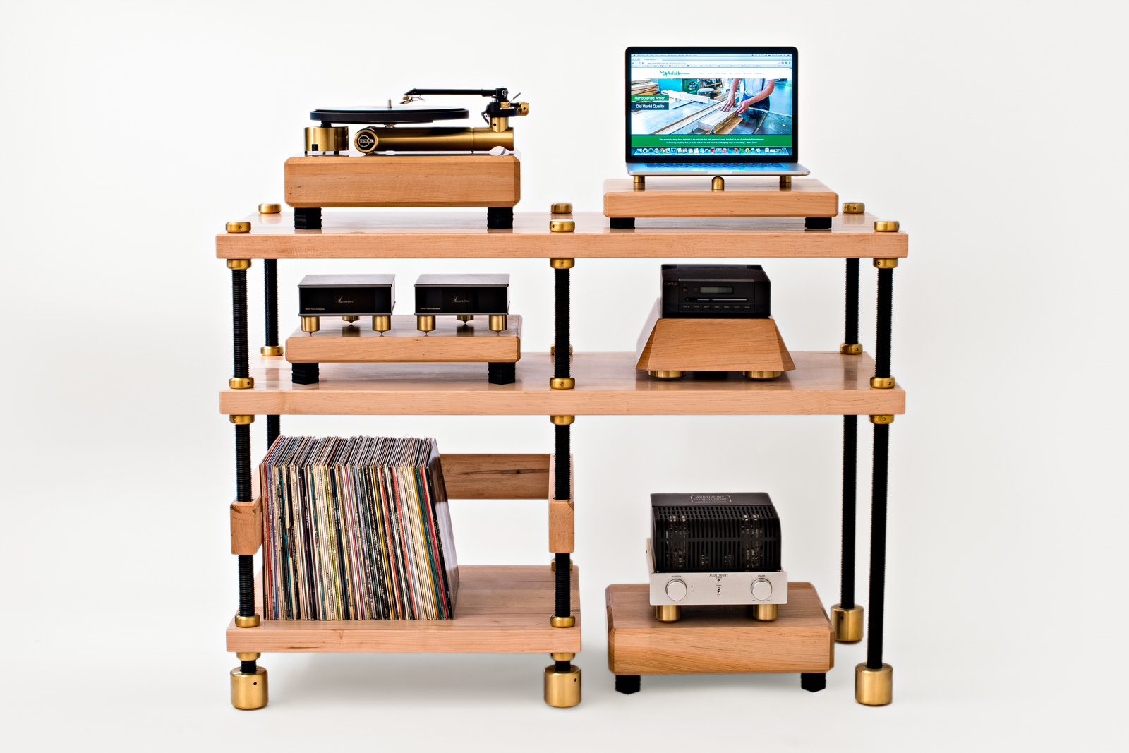Air-dried maple platforms, SAMSON shelves, and speaker stands serve as the optimal sink for receiving and dissipating the vibrational energy transferred out of the electronics or speaker by the footers. Our exhaustive tests of every space age damping material and composite used in high-end platforms today prove solid wood (not plywood or MDF) always sounds better. But each wood species—walnut, cherry, myrtle, mahogany, oak, bubinga, jatoba, etc.—sounds somewhat different and most sound somewhat colored. The same listening test series showed maple to always have, by a sizable margin, the most detailed, transparent and uncolored sound.